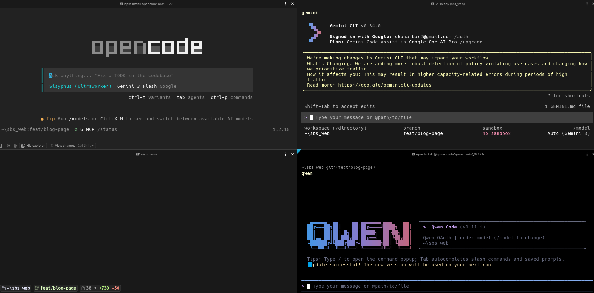 The screenshot above shows my actual daily setup: OpenCode on the left, Gemini CLI top-right, and Qwen Code bottom-right — all running in the same project simultaneously.